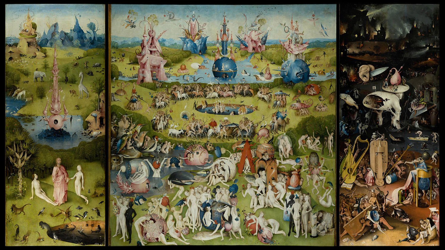 The two other original panels include scenes of God presenting Eve to Adam, and a hellscape portraying the torments of damnation. Art historians have interpreted the complete painting as a didactic warning on the perils of life’s temptations, but twentieth century musings debate whether the panel is a panorama of a paradise lost.