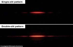 Lanza cites the double-slit test, pictured, to backup his claims. When scientists watch a particle pass through two slits, the particle goes through one slit or the other.
