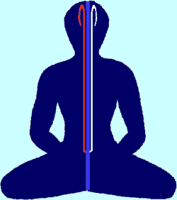- Visualise a ‘central channel’ about a 1cm thick from your perineum to the crown of your head and two ‘side channels’ going in through the nostrils up to the third eye or eyebrow level and then going down either side of the central channel merging at just below the navel. All the ‘channels’ are hollow like plumbing pipes. Take a moment to establish this visualisation, it does get easier and even instantaneous with practice. See image.