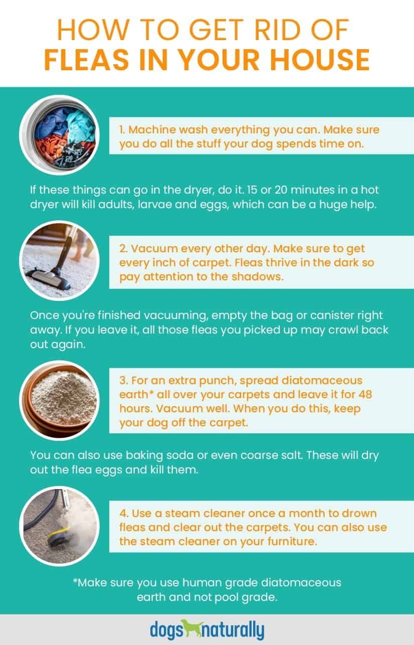 - For an extra punch, spread diatomaceous earth (DE) all over your carpets and leave it for 48 hours. Vacuum well. When you do this, keep your dog off the carpet. Make sure you use human grade DE and not pool grade. You can also use baking soda or even coarse salt. These will dry out the flea eggs and kill them.
