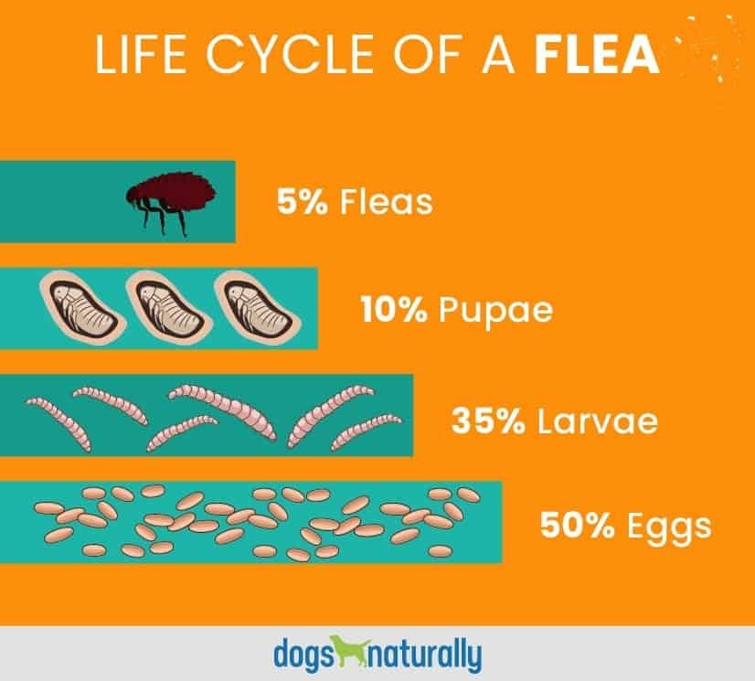 For every adult flea you see, there are way more in the 3 other stages of development (pupae, larvae and eggs) that you don’t spot. Up to 95% of fleas exist in these 3 stages.